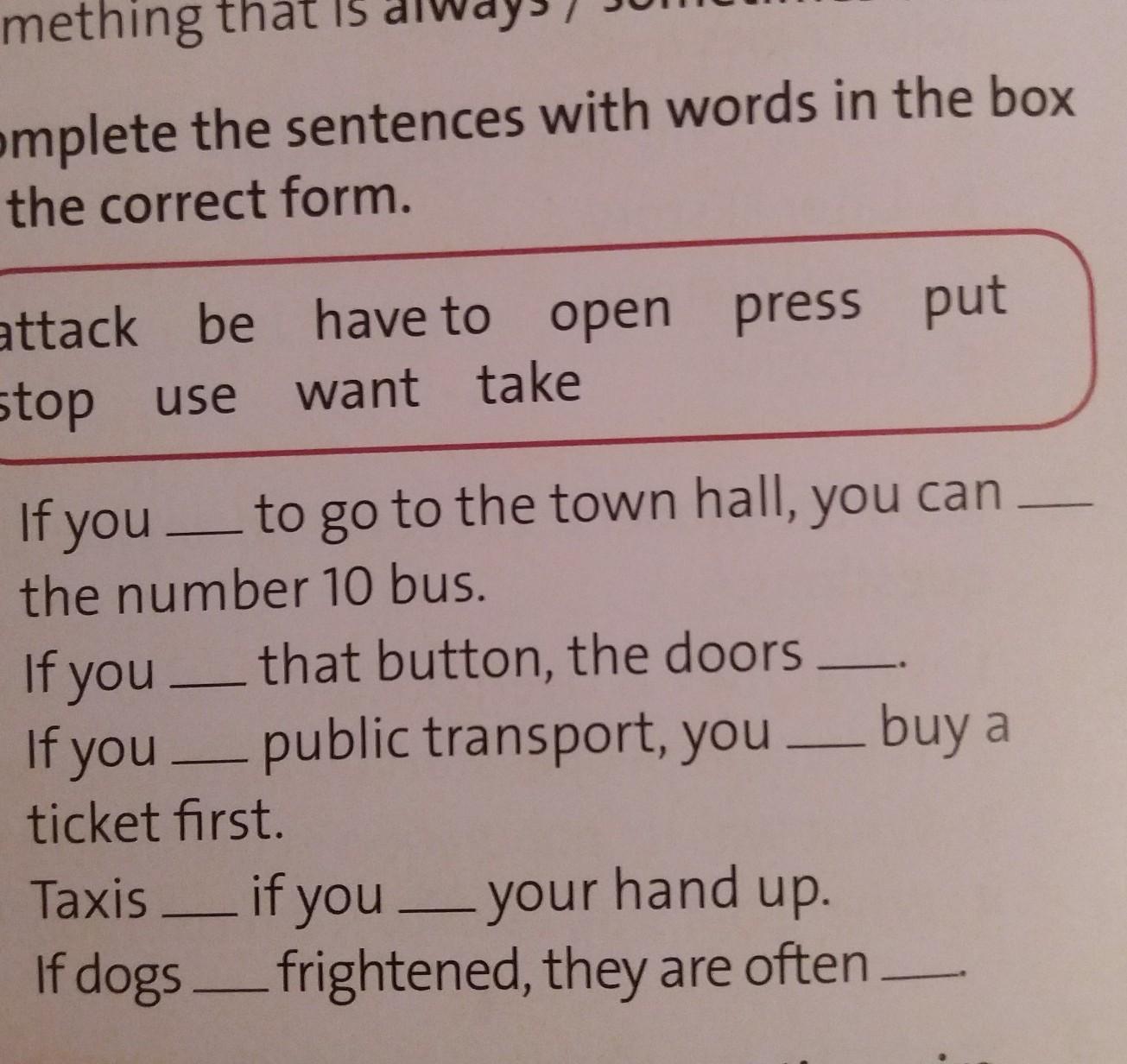 Помогите мне пожалуйста,очень нужно.Заранее вам спасибо,дай бог вам здоровья(слова:attack,be;have to, open,press,put;stop;use,want,take)