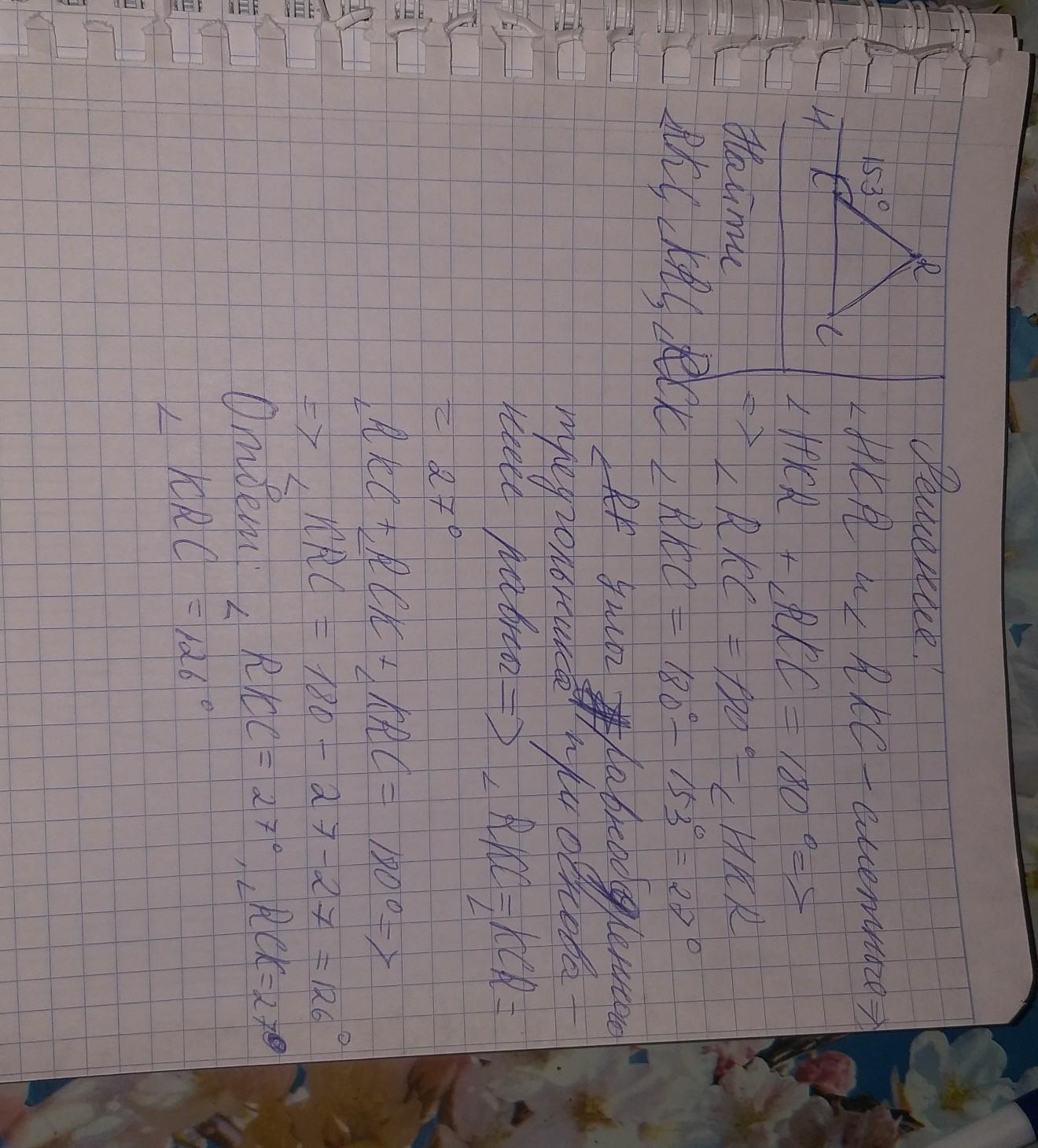 Угол К в треугольнике KRC = 27°, так как внешний угол К и угол К в треугольнике смежные. Сумма смежных углов = 180°. 180-153 = 27.