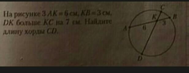 На рисунке AK 6 см , KB 3 см. DK больше KC на 7 см. Найдите длину хорды CD.