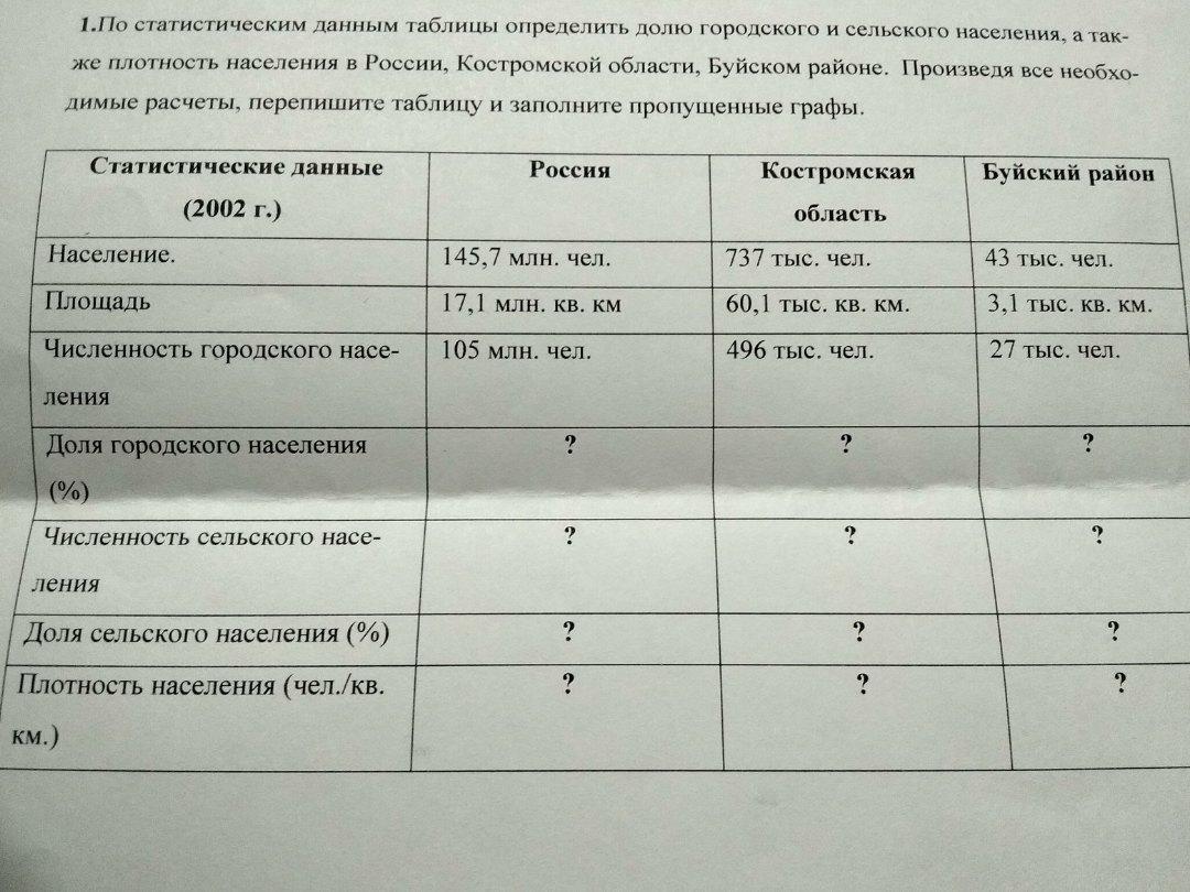 1. По статистическим данным таблицы определить долю городского и сельского населения, а также плотность населения в России, Костромской области, Буйском районе. Произведя все необходимы расчеты, перепишите таблицу и заполните пропущенные графы.