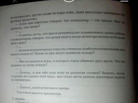 Составьте диалог используя данные реплики и заполняя пропущенные строки " Как ты относишься к компьютерным играм" Привет Рад тебя видеть Привет Я тоже рад Чем ты занимаешься на каникулах? мне родители недавно купили компьютер и теперь я увлёкся одна интересной игрой . честно говоря забросил всё остальное книги меня сейчас не интересуют продолжение в файле