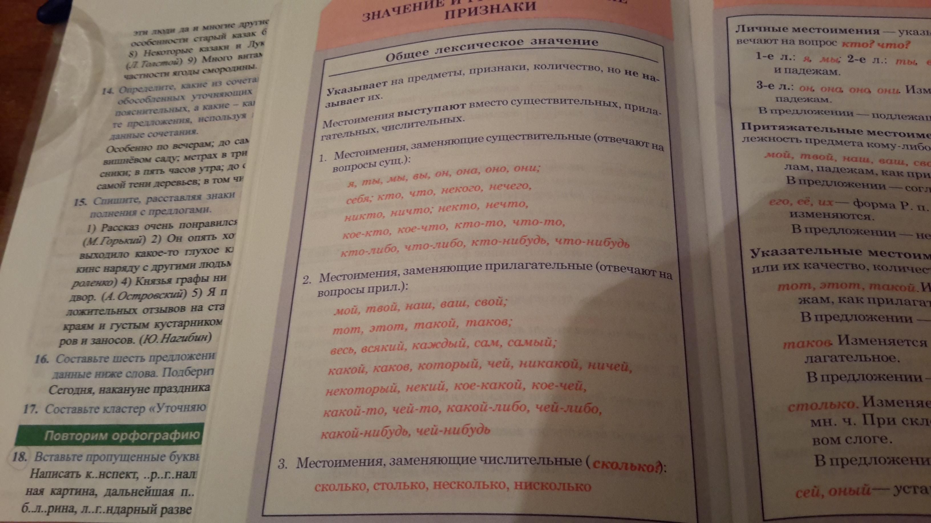 Что такое местоимение ? Что оно обозначает , на какие вопросы может отвечать ? г. на сколько разрядов делятся местоимения ? Назовите их З. Приведите 3 примера местоимений разряда . 4. Что обозначают отрицательные местоимения ? 5. Что обозначают неопределенные местоимения ? 6. Какие местоимения образуются от вопросительно - относительных местоимений и с помощью каких морфем ? 7. Какие местоимения изменяются как прилагательные ? 8 , на какие вопросы отвечают притяжательные местоимения ? 9. Назовите все указательные местоимения 10 Назовите все определительные местоимения Назовите все личные местоимения . Как изменяются местоимения разряда ? Как образуются отрицательные местоимения ? Как образуются неопределенные местоимения ? Когда у них встречается дефис ? Как отличить правописание приставок НЕ и НИ ? Во сколько слов пишутся местоимения ? Дайте полный ответ с 12. 13 14. 15 16 , пояснениями . 17 Как склоняются НЕКТО и НЕЧТО ? у каких местоимений полность ! о совпадает написание в некоторых 18. формах ? Как в этом случае определить разряд ? 19. Как пишутся личные местоимения ОН , ОНА , ОНИ в некоторых падежах ? 20 Как изменяется возвратное местоимение ? Расскажите , по какому плану происходит морфологический рпзбор 21. местоимения 22. Каким членом предложения может быть местоимение в тексте ? Приведите два примера 23. Какие местоимения не склоняются ? 24 , у каких местоимений нет именительного падежа ? 25. Какие местоимения пишутся с дефисом ? 26 Какие местоимения не изменяются ? Каким членом предложения могут быть местоимения разряда ? Какие л 27. 28. ичные местоимения изменянотся по падежам ? Как изменяется местоимение столько ?