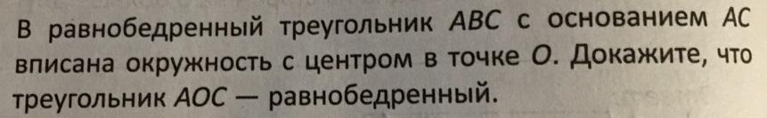 В равнобедренный треугольник ABC с основанием AC вписана окружность с центром в точке O. Докажите, что треугольник AOC -равнобедренный.