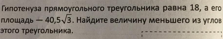 Гипотенуза прямоугольного треугольника равна 18, а его площадь - 40,5√3.Найдите величину меньшего из углов этого треугольника.