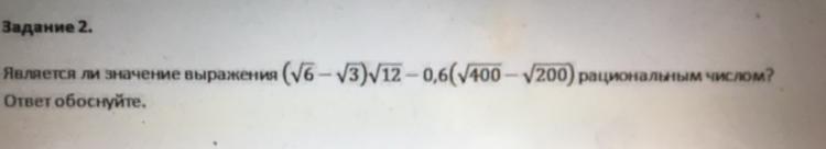 (√6-√3)*√12-0,6(√400-√200)=6√2-6-0,6*20+0,6*10√2=12√6-18, нет, не является, поскольку содержит иррациональное √6