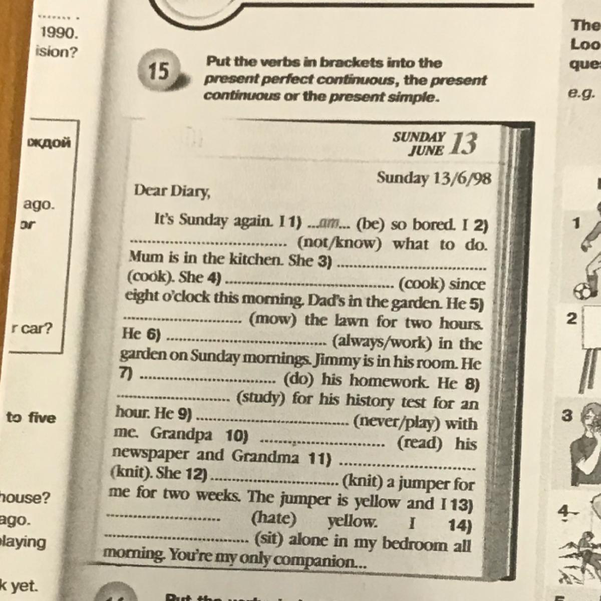 It’s Sunday again. I 1) am (be) so bored. I 2) don't know (not / know) what to do. Mum is in the kitchen. She 3) is cooking (cook). She 4) has been cooking (cook) since eight o’clock this morning. Dad’s in the garden. He 5) has been mowing (mow) the lawn for two hours. He 6) always works (always / work) in the garden on Sunday mornings. Jimmy is in his room. He 7) is doing (do) his homework. He 8) has been studying (study) for his history test for an hour. He 9) never plays (never / play) with me. Grandpa 10) is reading (read) his newspaper and Grandma 11) is knitting (knit). She 12) has been knitting (knit) a jumper for me for two weeks. The jumper is yellow and I 13) hate (hate) yellow. I 14) have been sitting (sit) alone in my bedroom all morning. You’re my only companion…