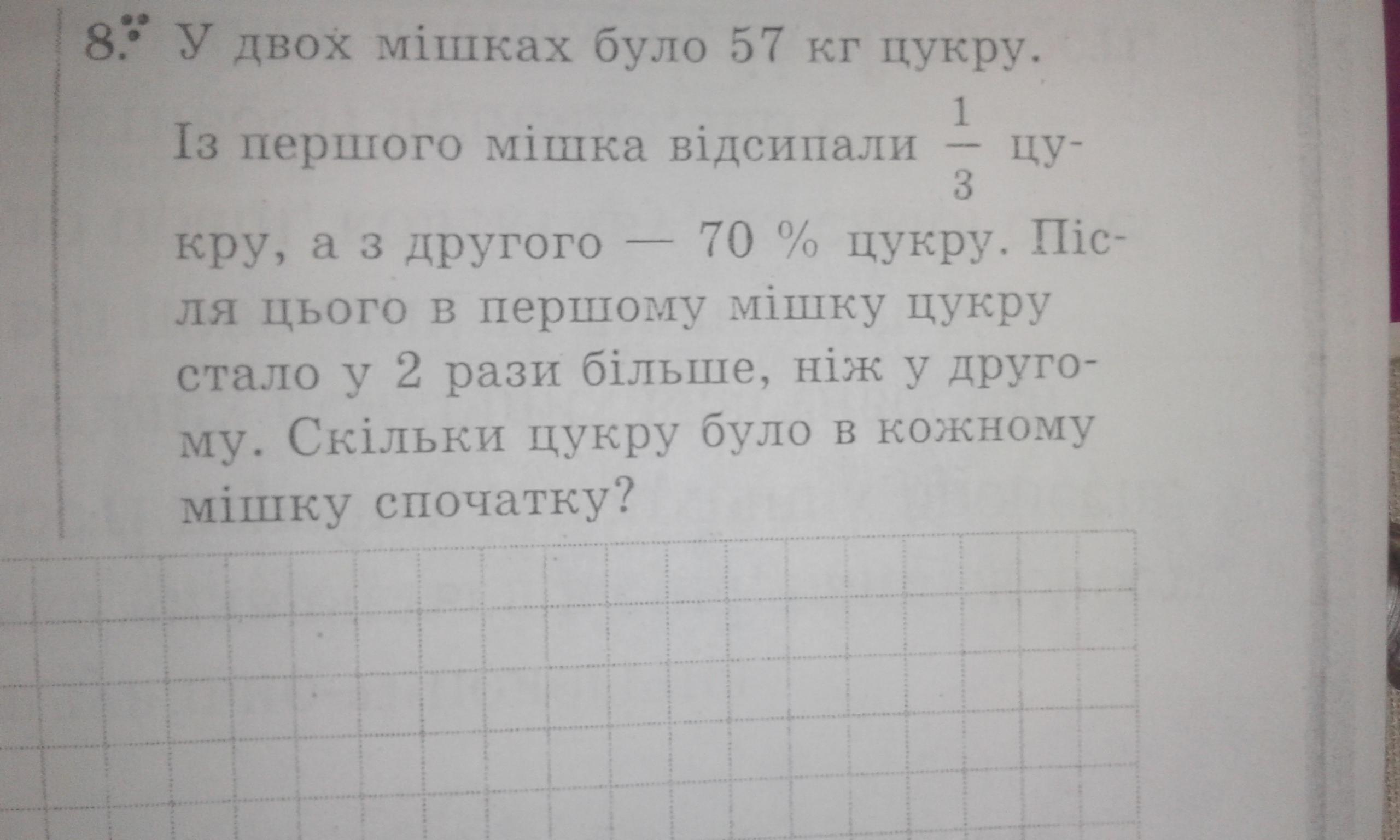 З І мішка відсипали 1/3 цукру і в ньому залишилось 1-1/3 = 2/3 частин цукру, що становить 2х/3 кг, а в ІІ мішку залишилось 100% - 70% = 30% цукру, що дорівнює 0,3(57 - х) кг. За умовою задачі 2х/3 = 2·0,3(57 - х).