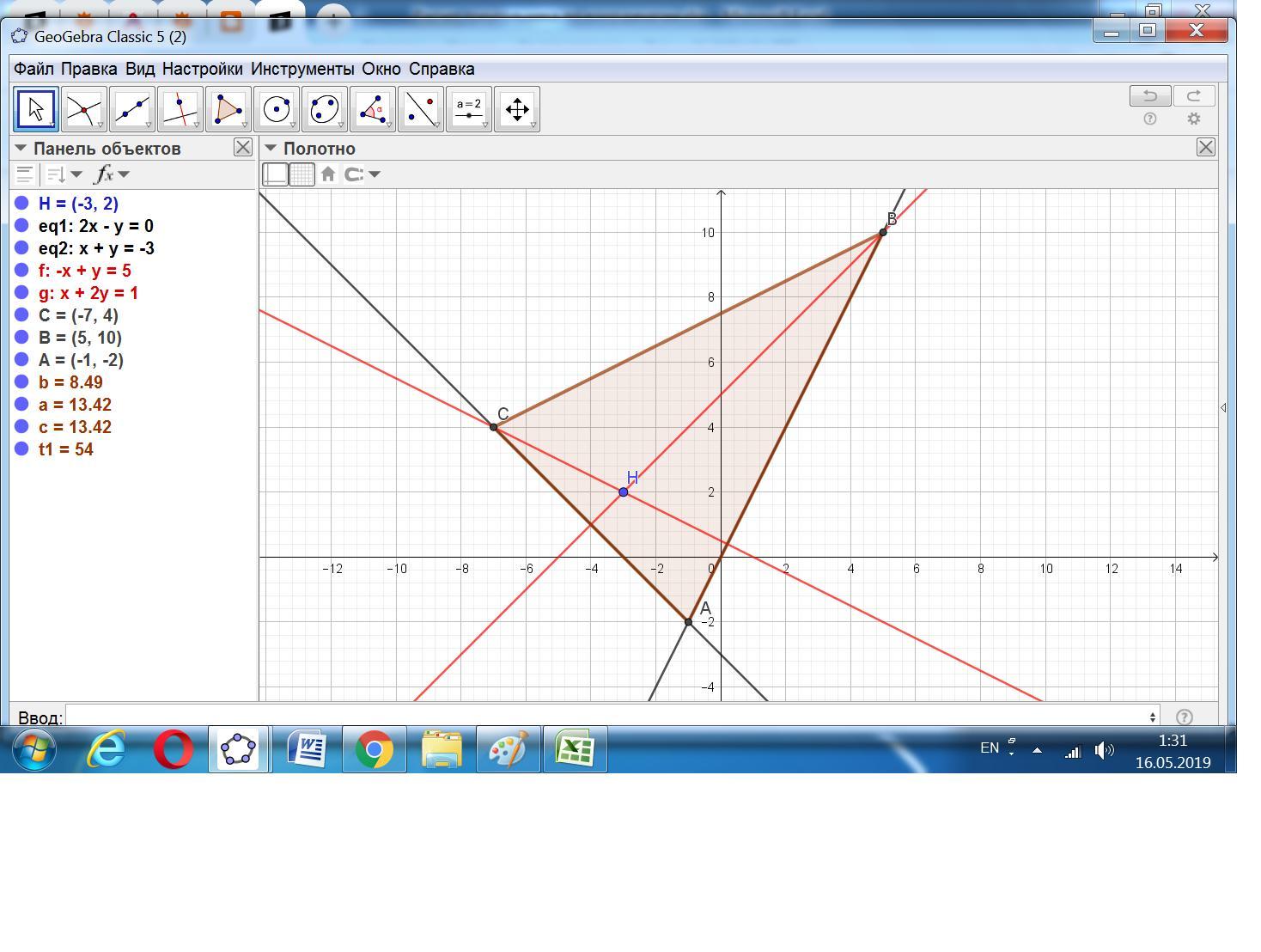 Далее определяем координаты вершин В и С как точек пересечения соответственно прямой АВ и высоты ВН, прямой АС и высоты СН.