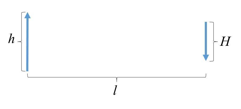 Предмет, высота которого h= 2 см, расположен на расстоянии l= 31 см от изображения, полученного в линзе (см. рис.). Высота изображения равна H= 2 см, определи вид линзы и расстояние от предмета до линзы.