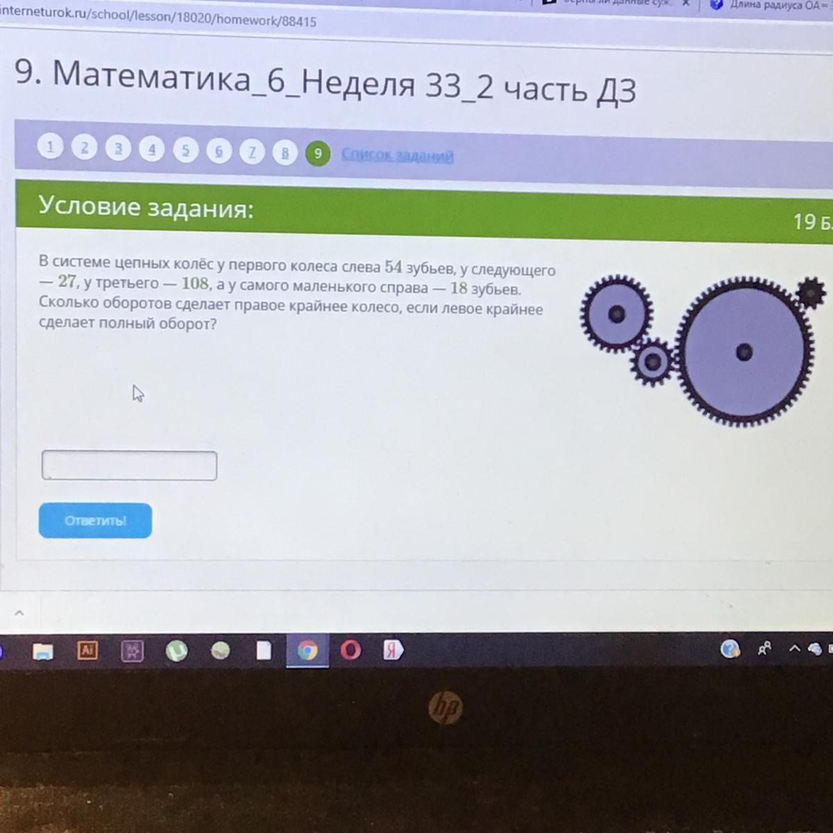 Причём передача (сколько зубьев и сколько оборотов делают промежуточные колёса) не имеет никакого значения. Поэтому если левое крайнее колесо сделает n1 = 1 оборот, и у него k1 = 54 зуба, а у правого крайнего 18 зубьев, то правое крайнее колесо сделает 54*1:18 = 3 полных оборота.