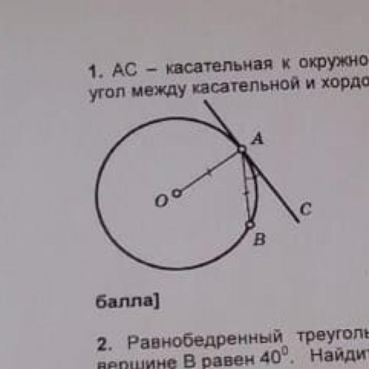 AC касательная к окружности. Хорда AB равна радиусу окружности найдите угол между касательной и хордой