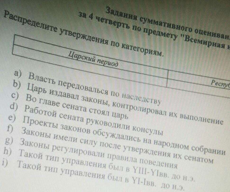 Распределите утверждения по категориям:1)Царский период 2)Республиканское правление