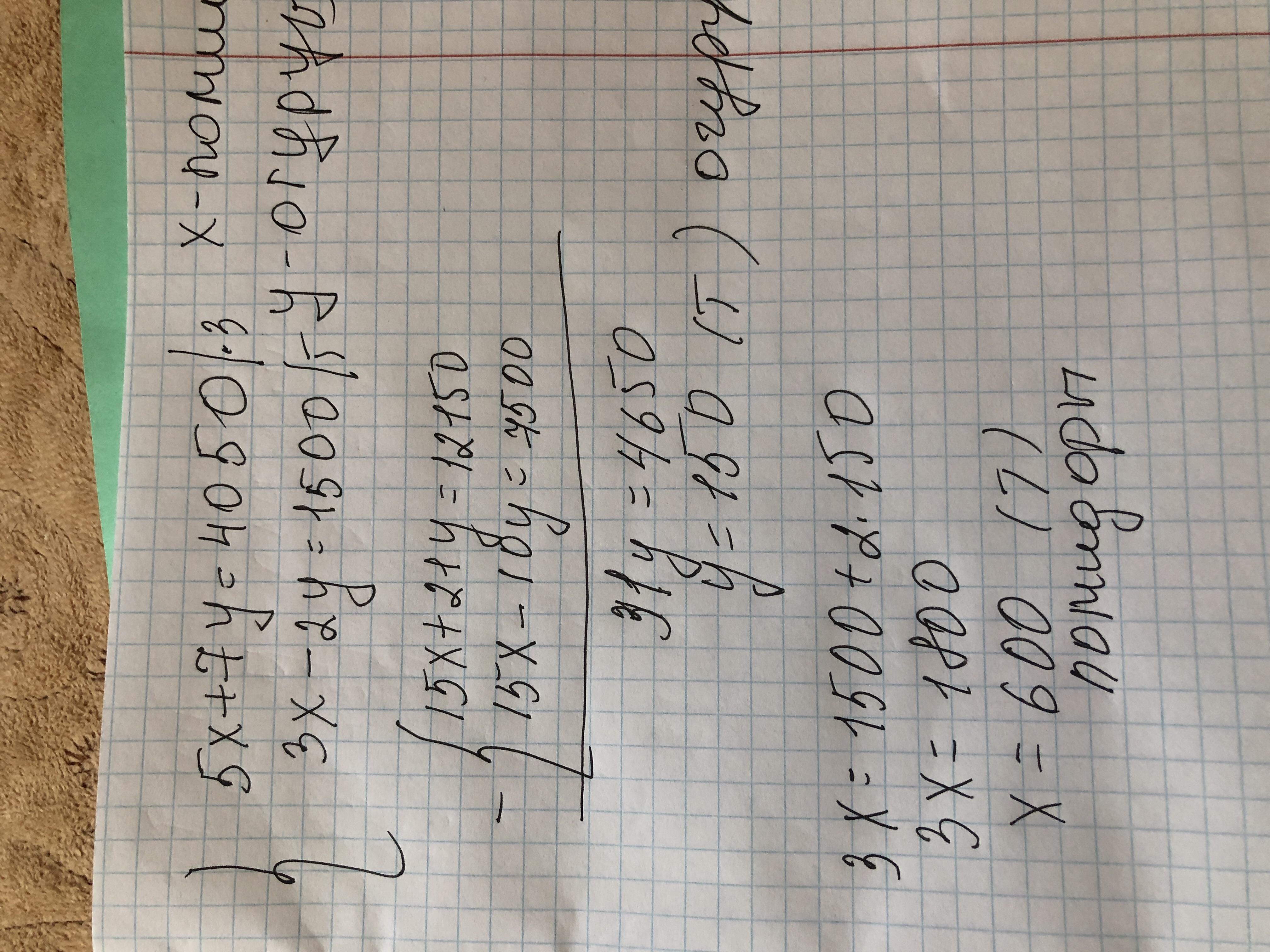 за 5кг помидоров и 7 огурцов кг заплатили 4050 тенге.Сколько стоит 1кг каждого вида овощей если 2кг огурцов на 1500 тенге дешевле чем 3кг помидоров