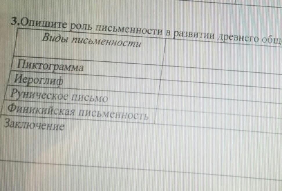 Опишите роль письменности в развитии древнего общества:Виды письменности,Описание ​