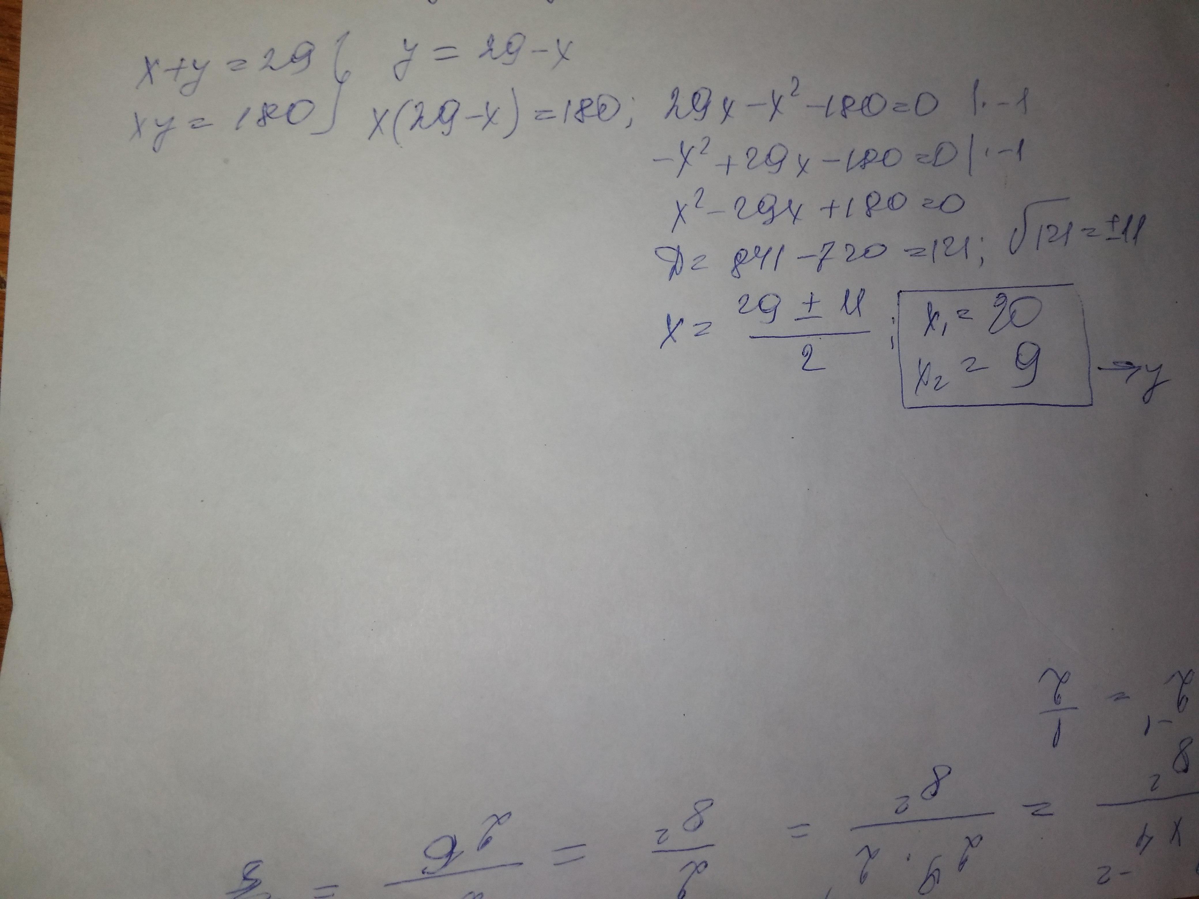 Известно,что сумма двух чисел равна 29,а произведение 180.Найдите эти числа с помощью квадратного уравнения