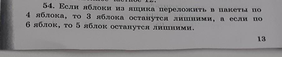 если яблоки из ящика переложить в пакетв пл 4 яблока то 3 яблока останутся лишними. а если по 6 яблок то 5 яблок останутся лишними