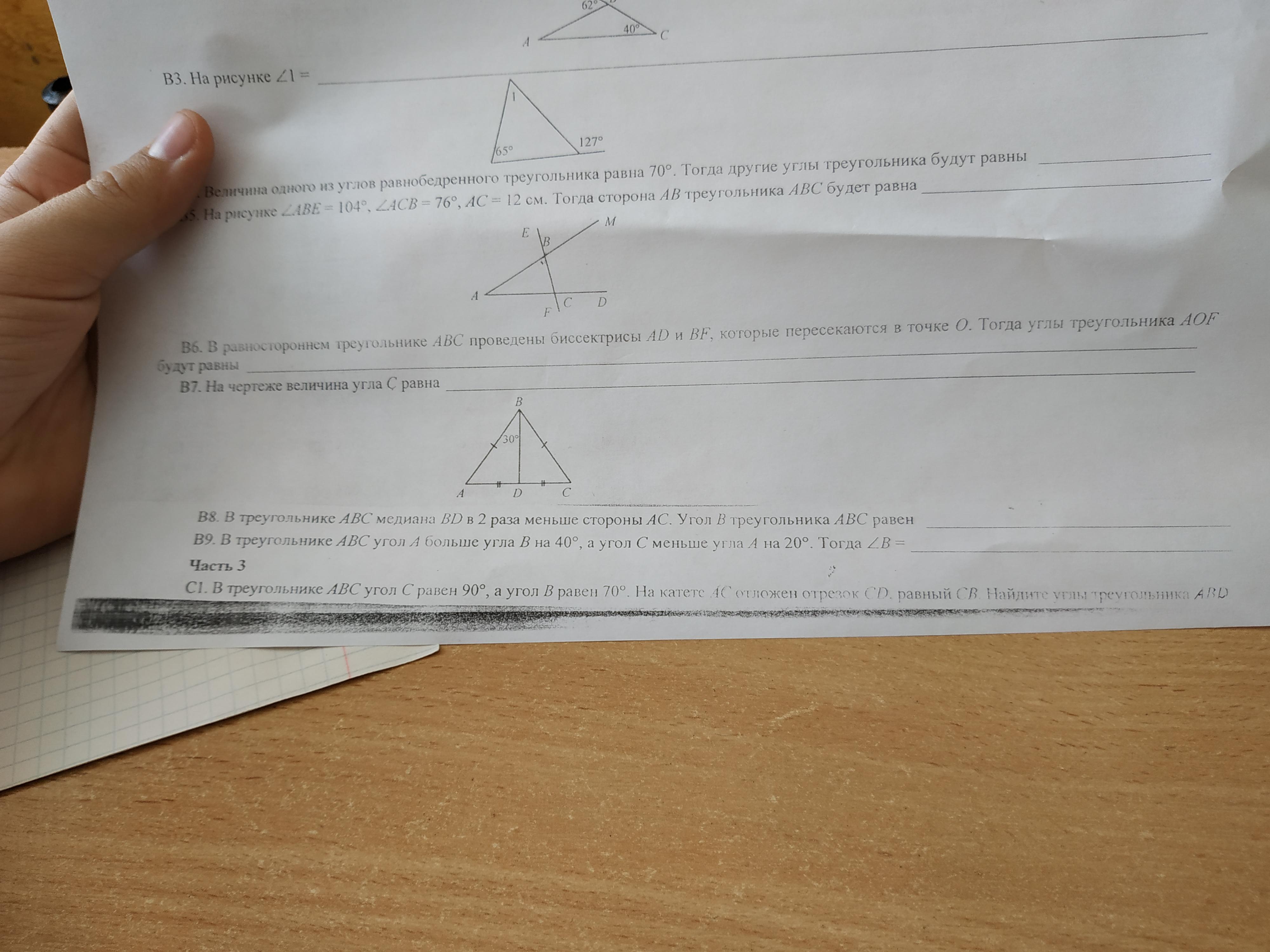 (Так как треугольники равны по двум сторонам и углу, угол DBC = DBA = 30 градусов, BDC = 90 градусов, угол C = 180-90-30=60)