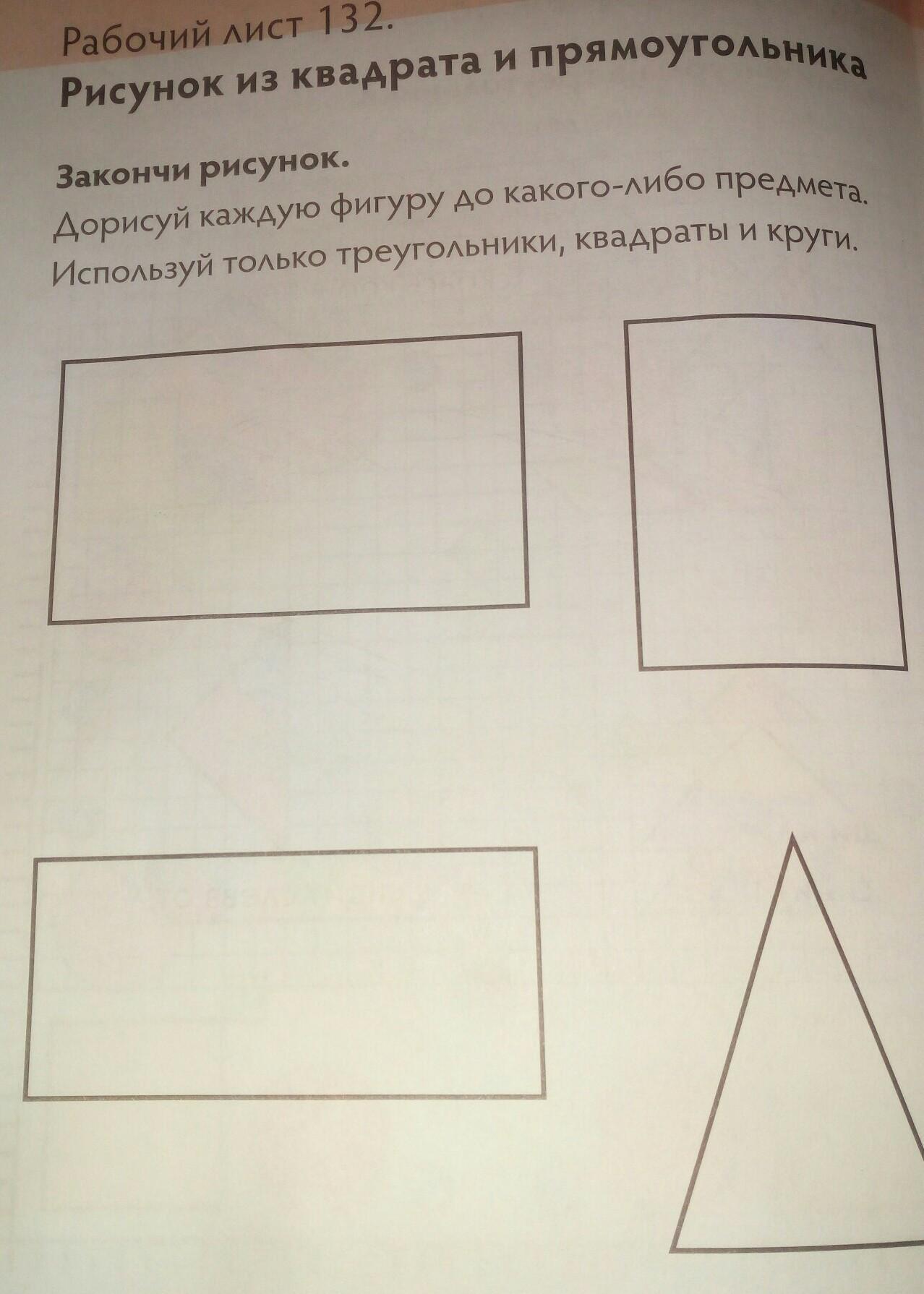 дорисуй каждую фигуру до какого либо предмета.используй только треугольники квадраты и круги