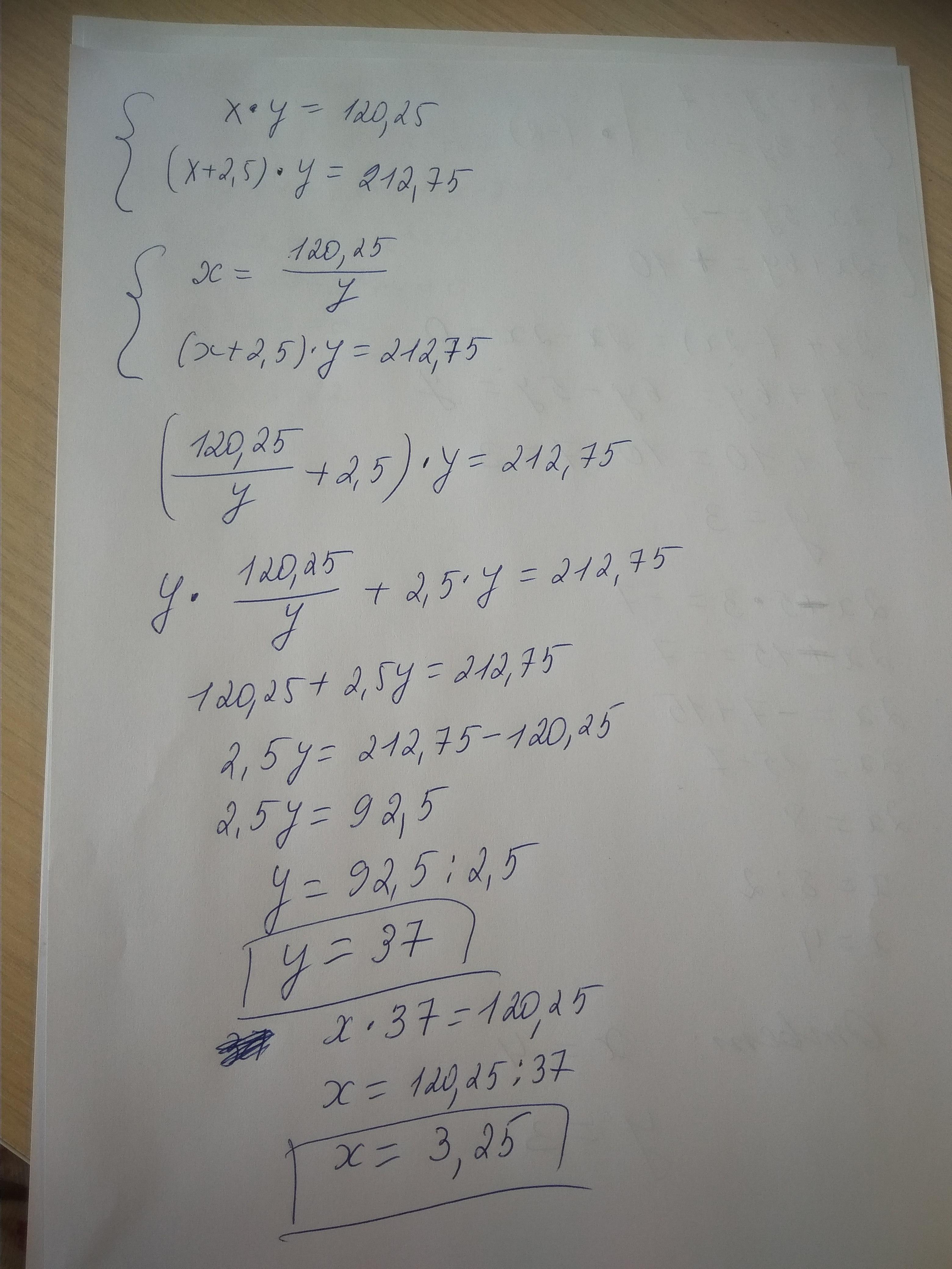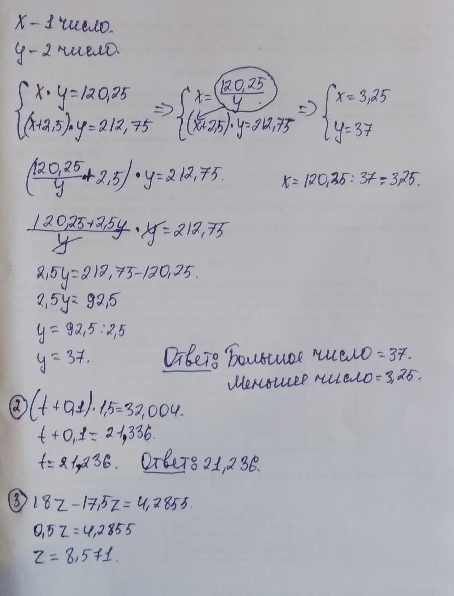 1)Произведение двух чисел равно 120,25. Если один из множителей увеличить на 2,5, а другой оставить без изменения, то произведение будет равно 212,75. Найди эти числа.