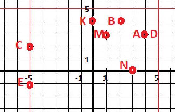 Постройте систему координат и отметьте точки: A (4; 3), B (2; 4), C (-5; 2), D (4; 3), E (-5; -1), M (1; 3), N (3; 0), K (0; 4).