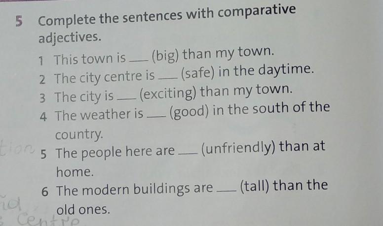Ответ:this town bigger than my town,the city centre is safer in the daytime,the city is excitinger thsm my toen,the weatheris gooder in the south of the country,the peoplehere are unfriendlyer than at home,the modern buildings are taller than the old ones