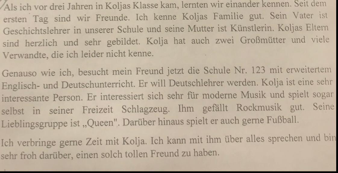 Также как и я, мой друг учится сейчас в школе № 123 с углублённым изучением английского и немецкого языков. Он хочет стать учителем немецкого языка. Коля - очень интересная личность. Он интересуется современной музыкой и даже сам играет в свободное время на ударных. Ему нравится рок музыка. Его любимая группа "Квин". Кроме того он любит играть в футбол.