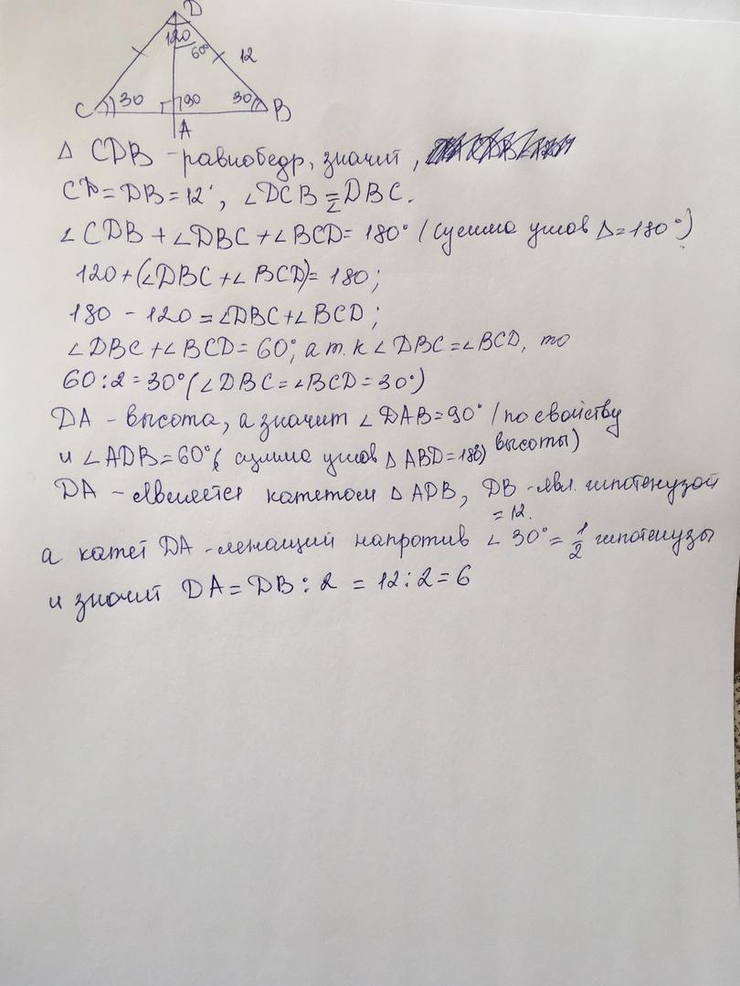 В равнобедренном треугольнике CDB с основанием CB : угол BDC = 120 °, боковая сторона 12 см. Найти высоту DA