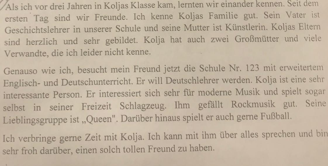 Также как и я, мой друг учится сейчас в школе № 123 с углублённым изучением английского и немецкого языков. Он хочет стать учителем немецкого языка. Коля - очень интересная личность. Он интересуется современной музыкой и даже сам играет в свободное время на ударных. Ему нравится рок музыка. Его любимая группа "Квин". Кроме того он любит играть в футбол.