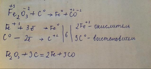Рассмотрите реакцию Fe2O3+C=Fe+CO как окислительно востановительную. Составьте уравнение реакции, схему электронного баланса, укажите окислитель и востановитель