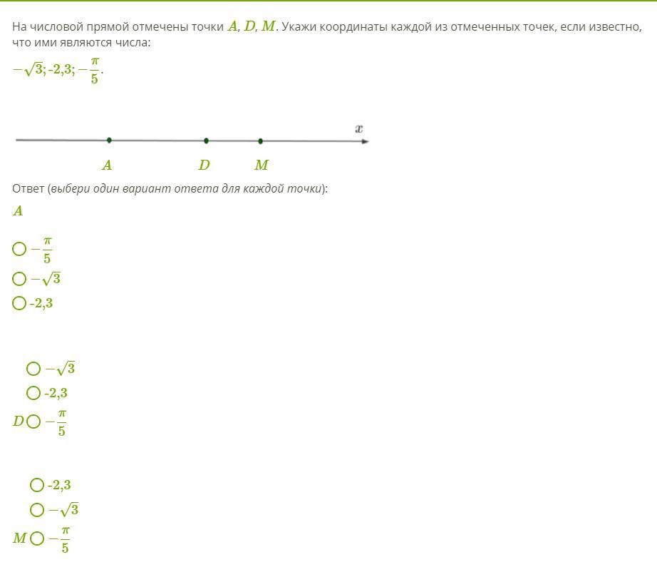 На числовой прямой отмечены точки A, D, M. Укажи координаты каждой из отмеченных точек, если известно, что ими являются числа: