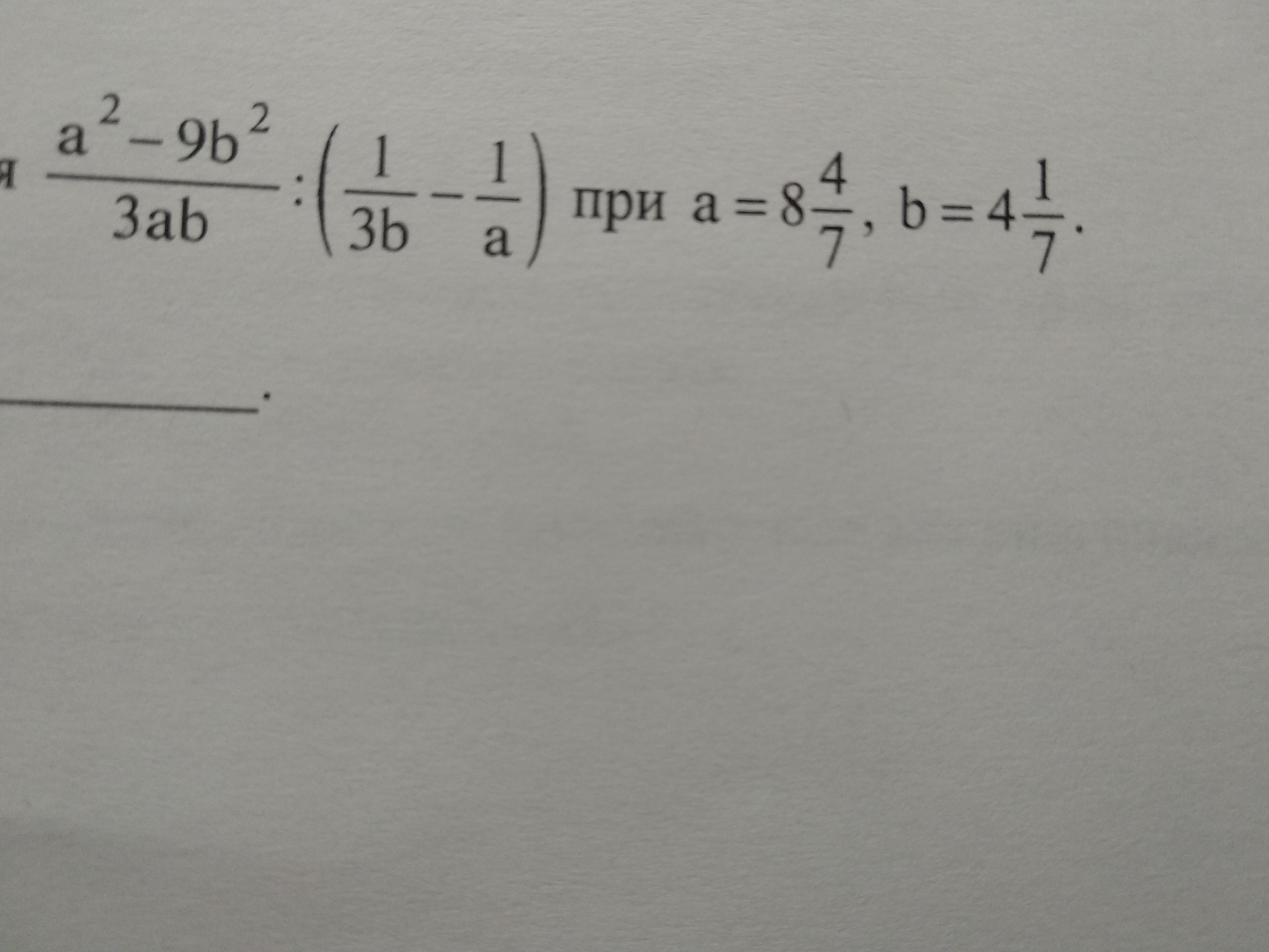 а^2 - 9б^2 / 3аб : (1/3б - 1/а) при а = 8 4/7 б =4 1/7