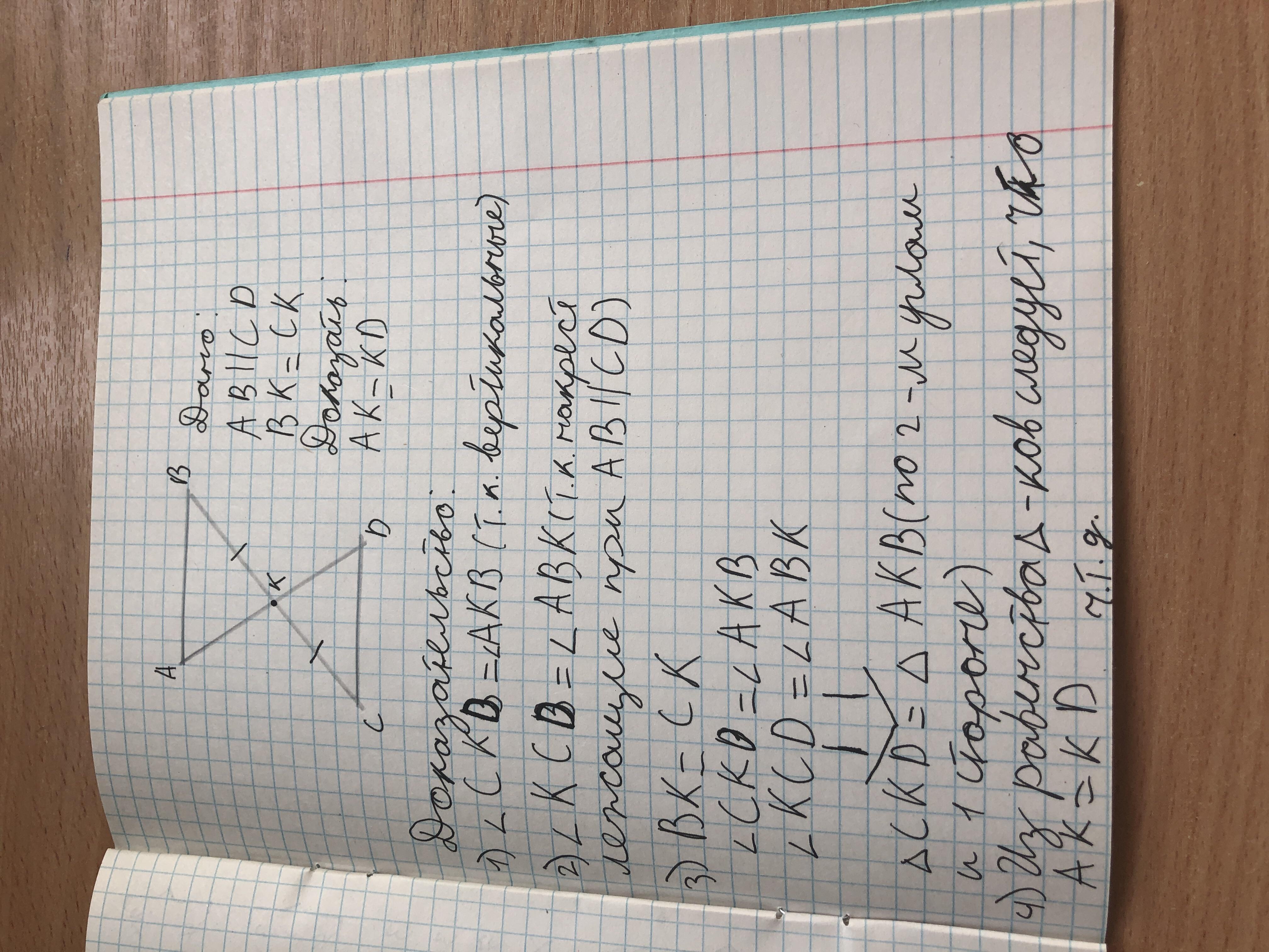 Два отрезка АД и СВ пересекаются в точке К. Известно, что АВ параллелен СД и ВК=СК. Докажите равенство отрезков АК и КД.