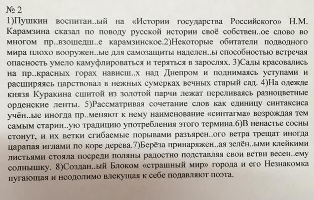 1. Пушкин, воспитанный на «Истории государства Российского» Н.Карамзина, сказал по поводу русской истории своё собственное слово, во многом превзошедшее карамзинское. 2. Некоторые обитатели подводного мира, плохо вооруженные для самозащиты, наделены способностью, встречая опасность, умело камуфлироваться и теряться в зарослях. 3. Сады красовались на прекрасных горах, нависших над Днепром, и, поднимаясь уступами и расширяясь, царствовал в нежных сумерках вечный старый сад. 4. На одежде князя Куракина, сшитой из золотой парчи, лежат, переливаясь, разноцветные орденские ленты. 5. Рассматривая сочетание слов как единицу синтаксиса, учёные иногда применяют к нему наименование "синтагма", возрождая тем самым старинную традицию употребления этого термина. 6. В ненастье сосны стонут, и их ветки, сгибаемые порывами разъярённого ветра, трещат, иногда царапая иглами по коре дерева. 7. Берёза, принаряженная зелёными клейкими листьями, стояла посреди поляны, радостно подставляя свои ветви весеннему солнышку. 8. Созданный Блоком "страшны мир" города и его Незнакомка, пугающая и неодолимо влекущая к себе, подавляют поэта.