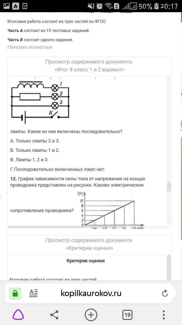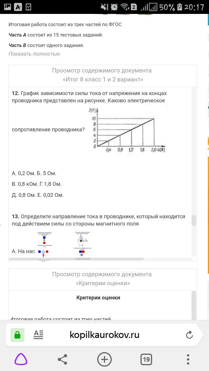 12. График зависимости силы тока от напряжения на концах проводника представлен на рисунке. Каково электрическое сопротивление проводника?