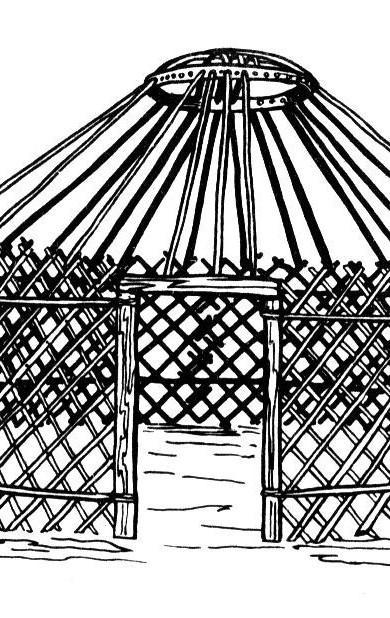 Основные части юрты: кереге/канат (решетчатые складные стенки), уук/уык (жерди, составляющие купол), тюндюк/шанырак (круг на вершине купола, скрепляющий жерди), ергенек(дверца входа), кошма, покрывающая все сооружение.