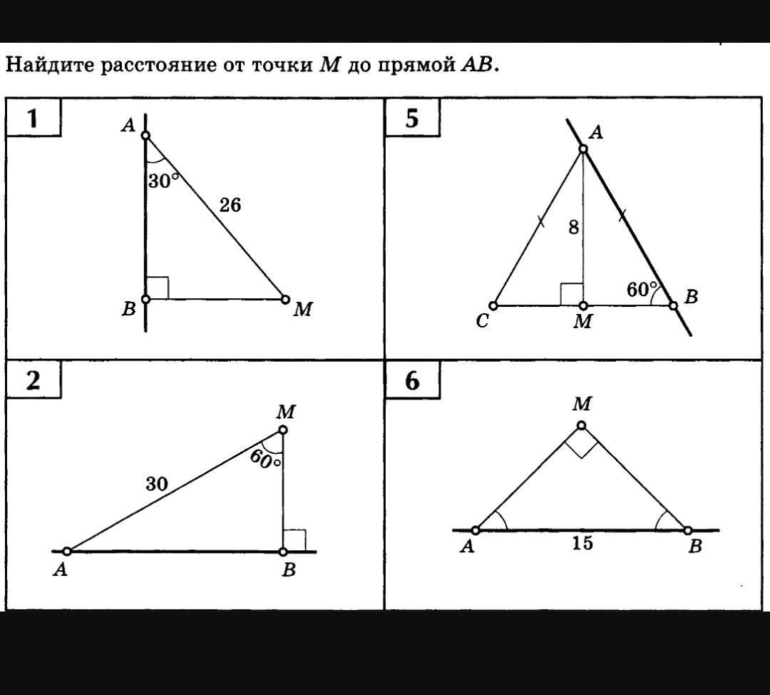 5. Я прикрепил рисунок к заданию. Нам нужно будет найти расстояние от точки M до AB, то есть перпендикуляр MF. Сумма острых углов прямоугольного треугольника равна 90°, тогда угол B + угол A = 90°. Угол B = 60° по условию, значит угол A = 30°. Тогда MF = 1/2 AM, так как MF – катет, лежащий напротив угла в 30. AM по условию равно 8, значит MF = 4.