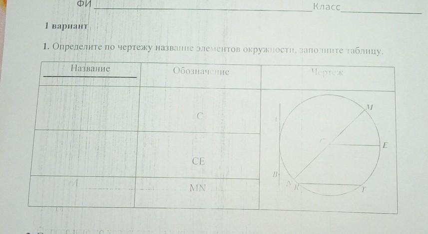1. Определите по чертежу название элемено окружності, зато шите таблицу.