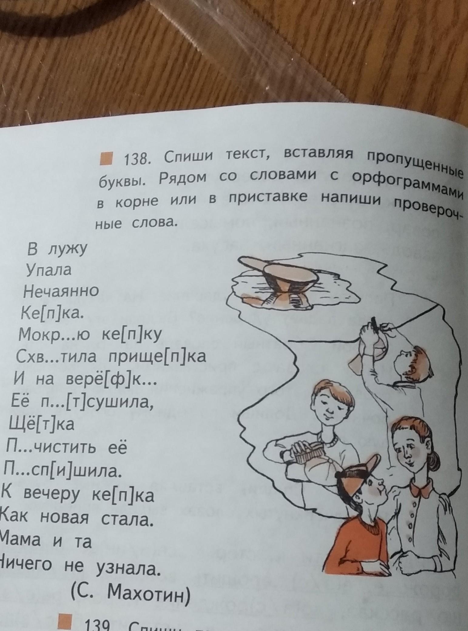 В лужу упала нечаянно кепка.Мокрую кепку схватила прищепка, и на веревке ее подсушила.Щетка почистить ее поспешила. К вечеру кепка как новая стала.Мама и так нечего не узнала.