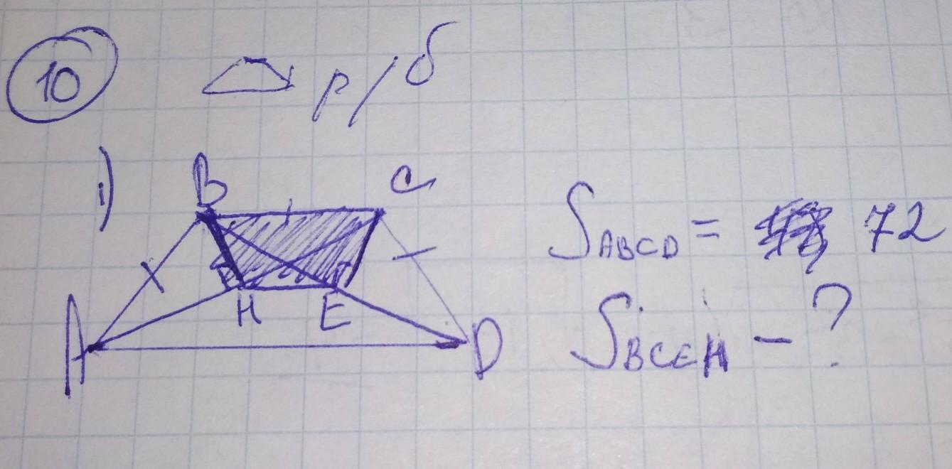 пожалуйста, геометрия 8 класс найдите площадь трапеции BCEH площадь ABCD 72, две диагонали(см рисунок) других данных нет. решите пожалуйста