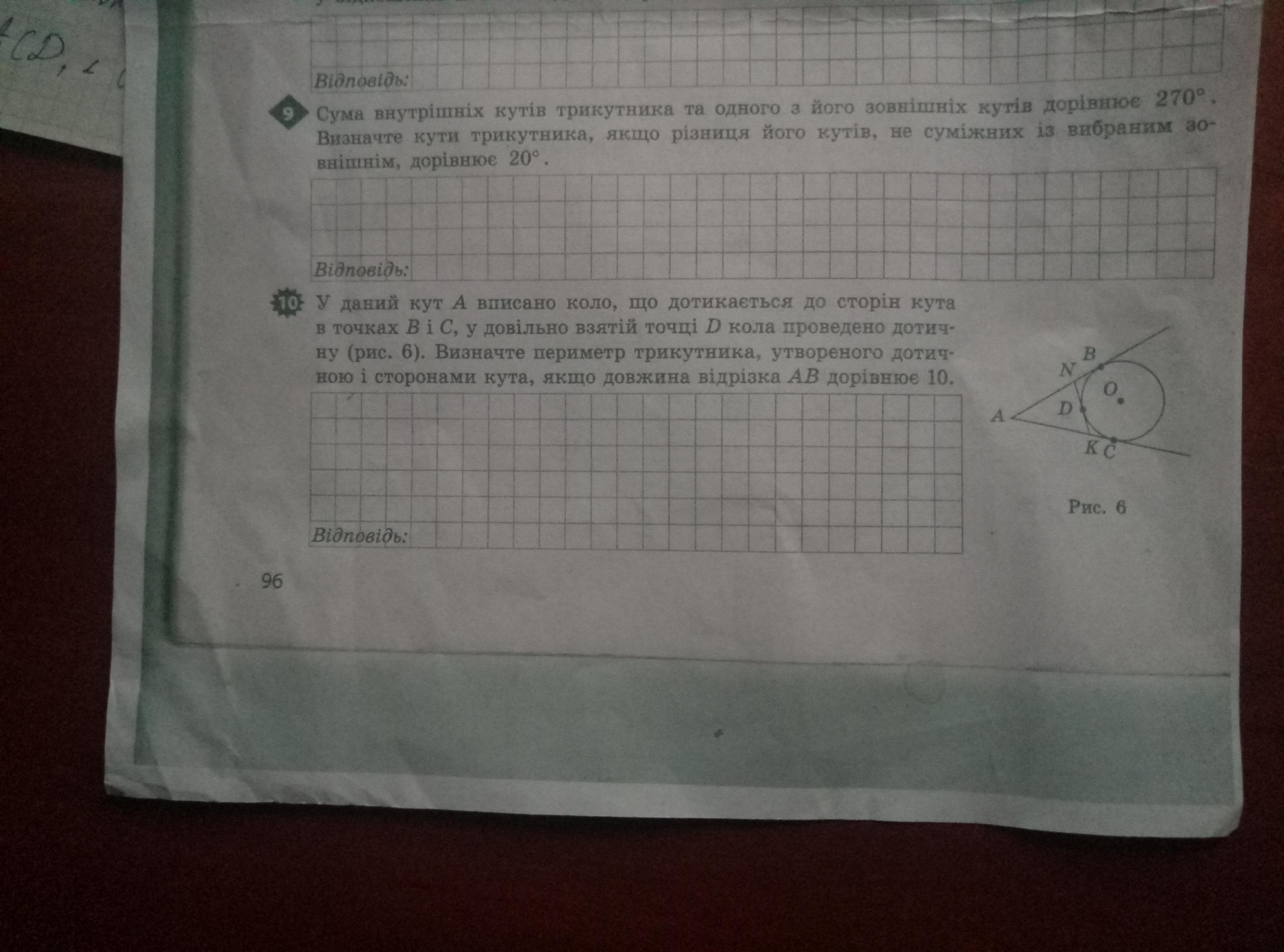Даю 80 балів! У даний кут A вписано коло, що дотикається до сторін кута в точках B і C, у довільно взятій точці D кола проведено дотичну. Визначте периметр трикутника, утвореного дотичною і сторонами кута, якщо довжина відрізка AB дорівнює 10