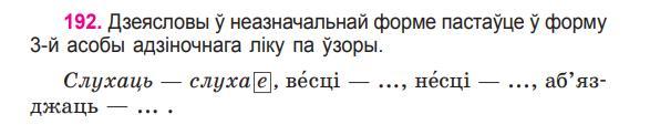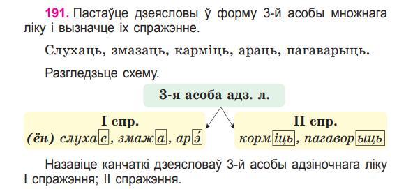Слухаць- слухаюць ( | спр., -юць), змазаць - змажуць ( | спр., -уць), кармiць - кормяць ( || спр., -яць), араць - аруць ( | спр., -уць) пагаварыць - пагавораць ( || спр, -аць).