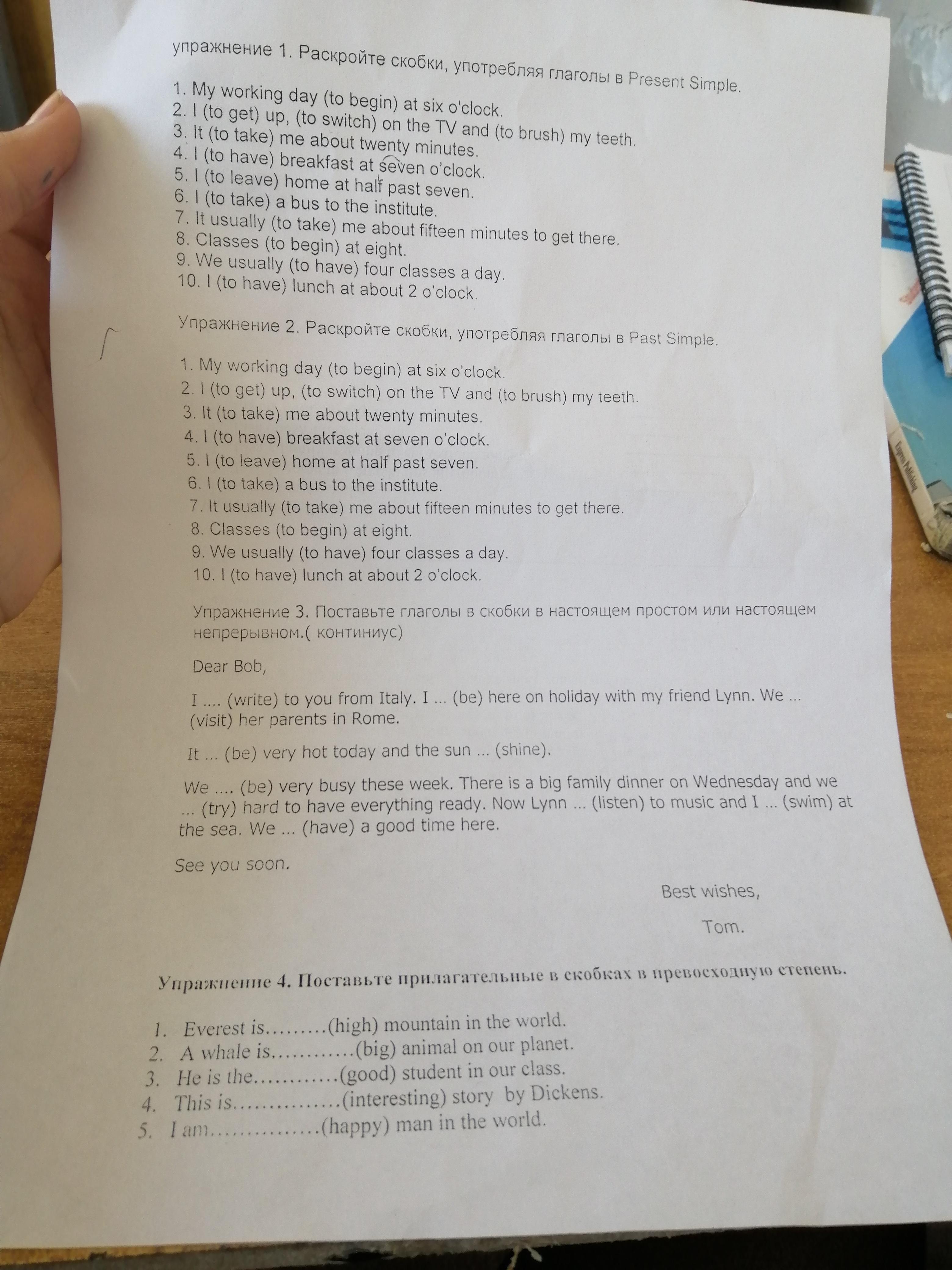 1. begins 2. get up; switch; brush 3. takes 4. have 5. leave 6. take 7. takes 8. begins 9. have 10. have