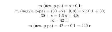 Обозначим исходное количество вещества в его 10 %-м растворе за х г. Тогда масса вещества в его 16 %-м растворе будет 30 + x г. Отсюда имеем: