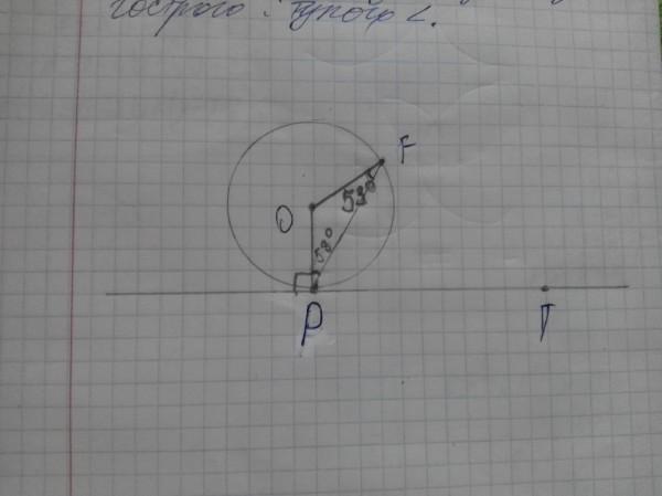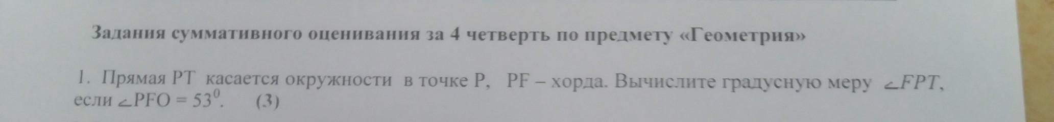 прямая PT касается окружности в точке P PF - Хорда Вычислите градусную меру FPT если PFO = 53 градуса