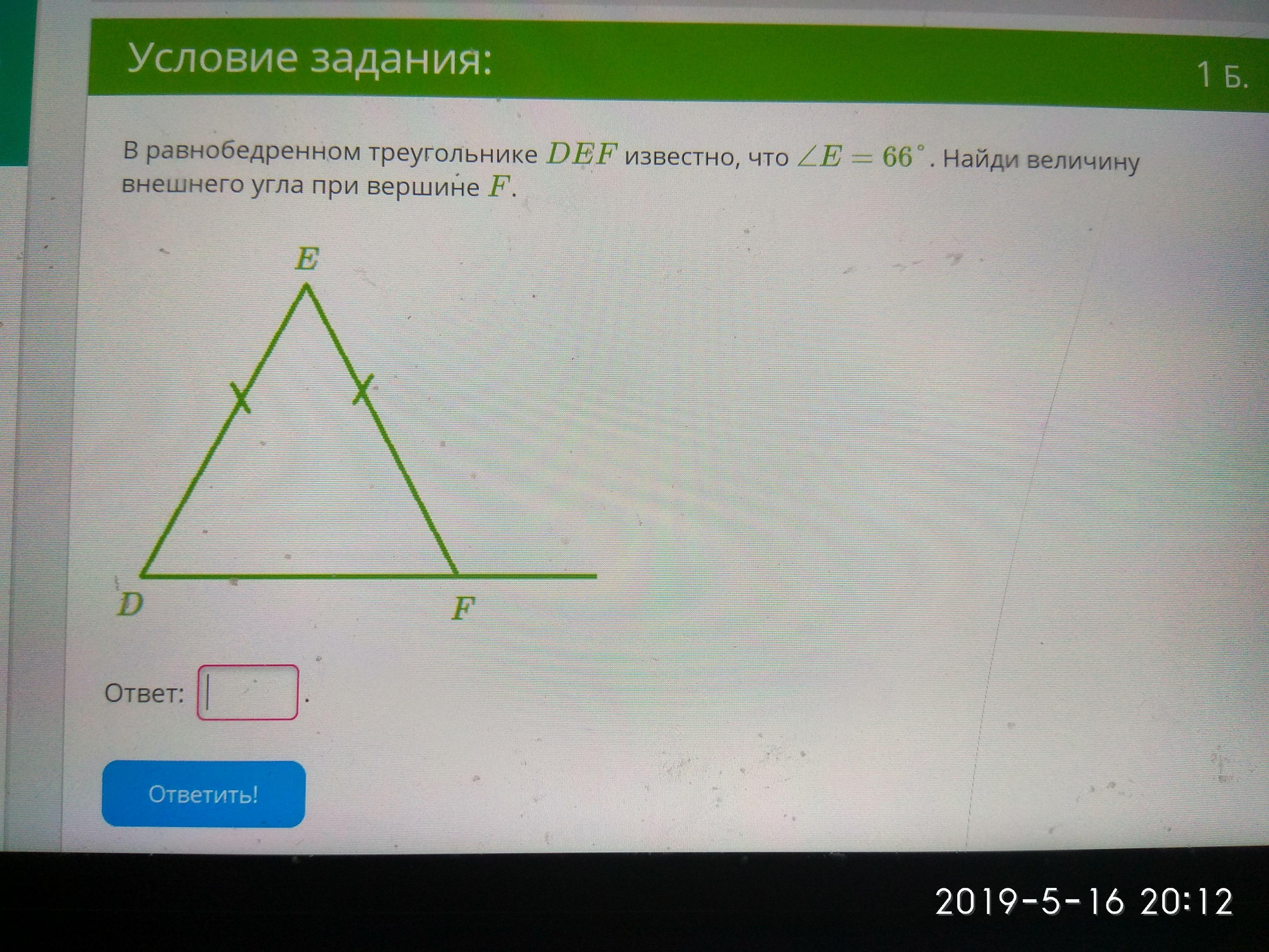 Сумма углов тр-ка = 180°, тогда <D = <F = (180° - 66°)/2 = 114°/2 = 57 °