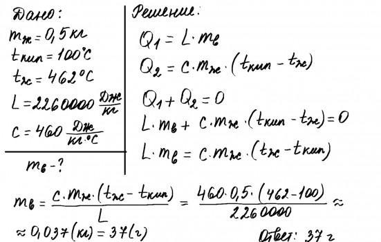 В калориметр опускают железный куб массой 0,5 кг, в котором находится вода при температуре кипения 100 °С. Температура железного куба равна 554 °С. Определи массу испарившейся воды. (Удельная теплота парообразования воды L=2260000 Дж/кг, удельная теплоёмкость железного куба c=460 Дж/кг·°С).