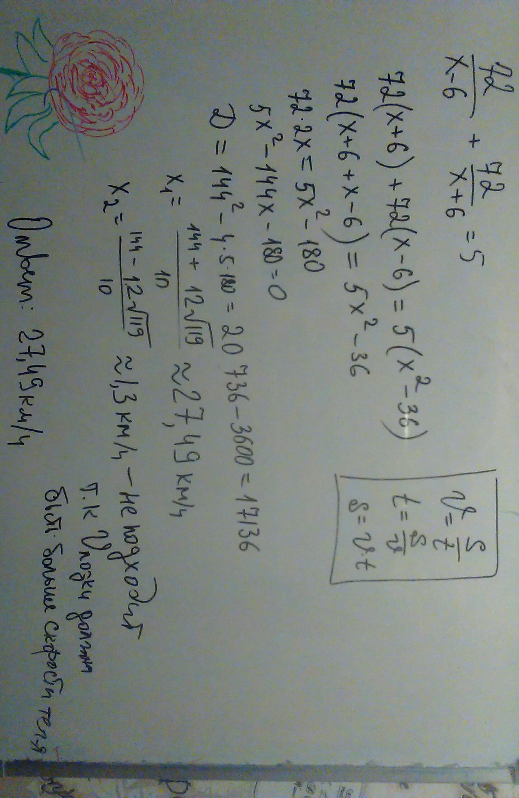 !Лодка проплыла 72 км против течения и вернулась обратно,потратив на всю дорогу 5 часов ,а скорость течения 6 км/час. Найти собственную скорость лодки