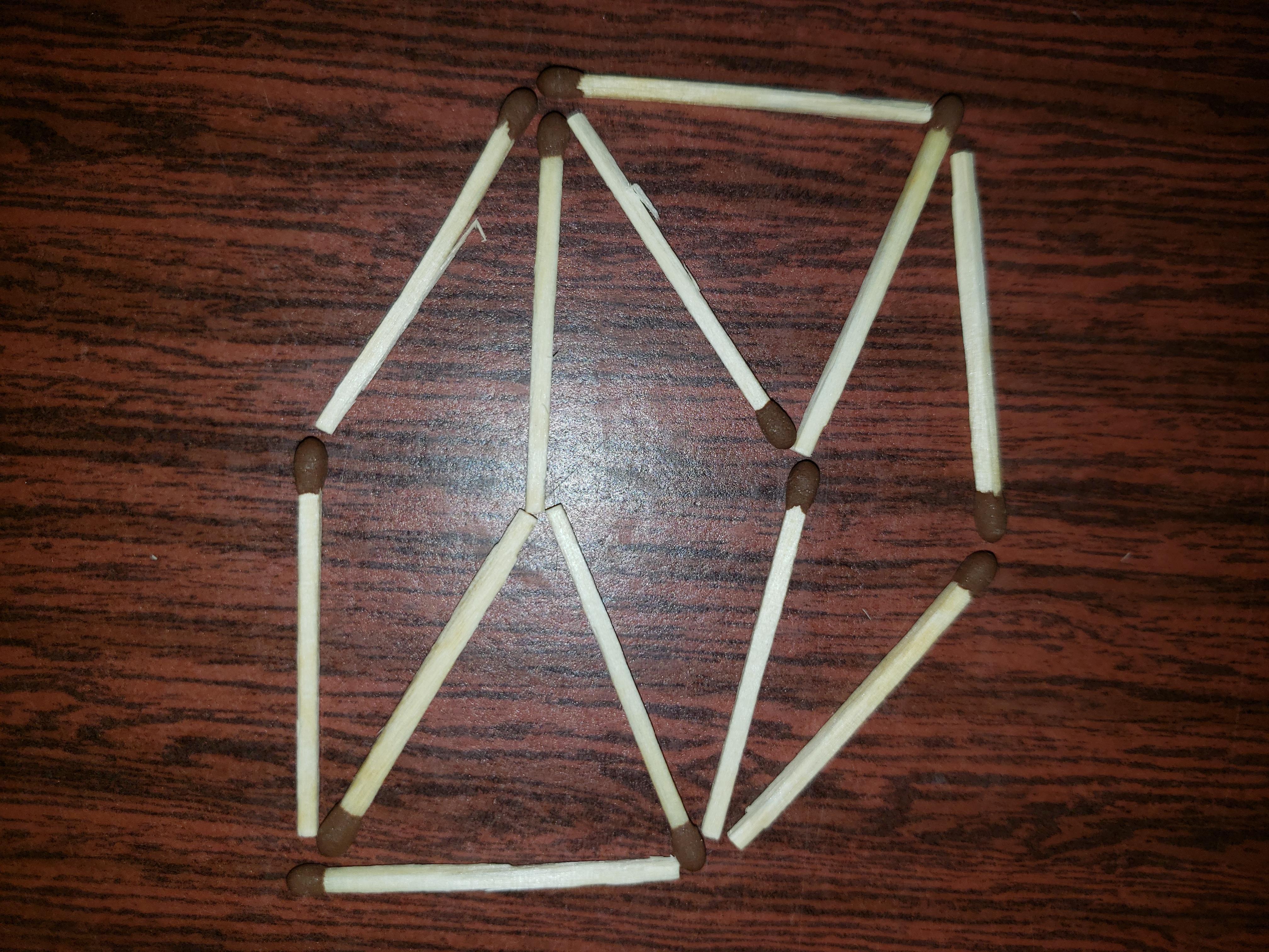 Из 12 спичек нужно составить фигуру, в которой было бы три одинаковых четырехугольника и два одинаковых треугольника.