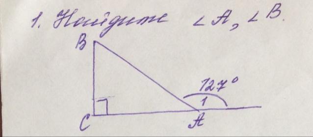 ∠А=180-127=53°,т.к треугольник прямоугольный ∠С=90°,то ∠В=90-53=37°(так как сумма острых углов в прямоугольном треугольнике 90°)
