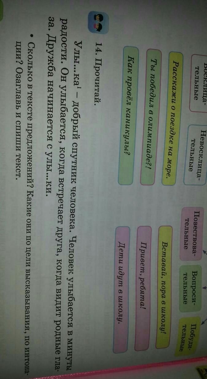 "Улыбка" В тексте 4 предложение по цели выск. 2-повествовательное,2-воскл.